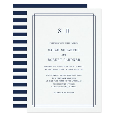 Elegant, simple and formal, our Timeless monogram wedding invitation features a navy blue geometric border framing your wedding details in classic lettering, topped by your…